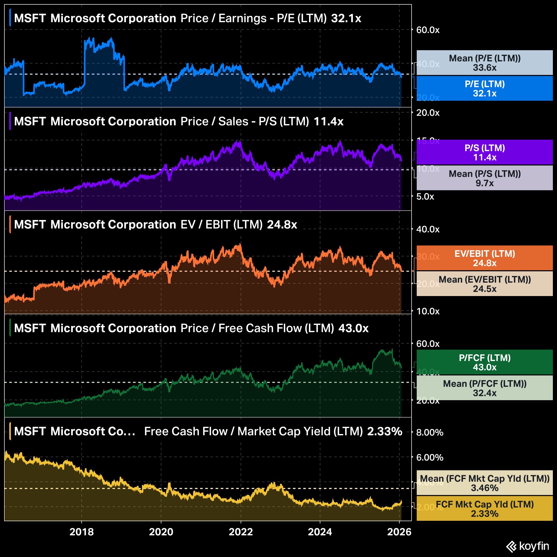 Nvidia bei 45,4x KGV (Mittel: 64x) sieht relativ günstig aus, bis man KUV betrachtet: 23,8x versus Mittel 19,2x. Das EV/EBIT von 40 x liegt unter dem Mittel von 56,2x, weil die operative Profitabilität explodiert ist. FCF Yield von 1,74 % (Mittel: 2 %). Microsoft bei 32,1x KGV (Mittel: 33,6x) ist das stabilste Multiple. KUV bei 11,4x (Mittel: 9,7x).