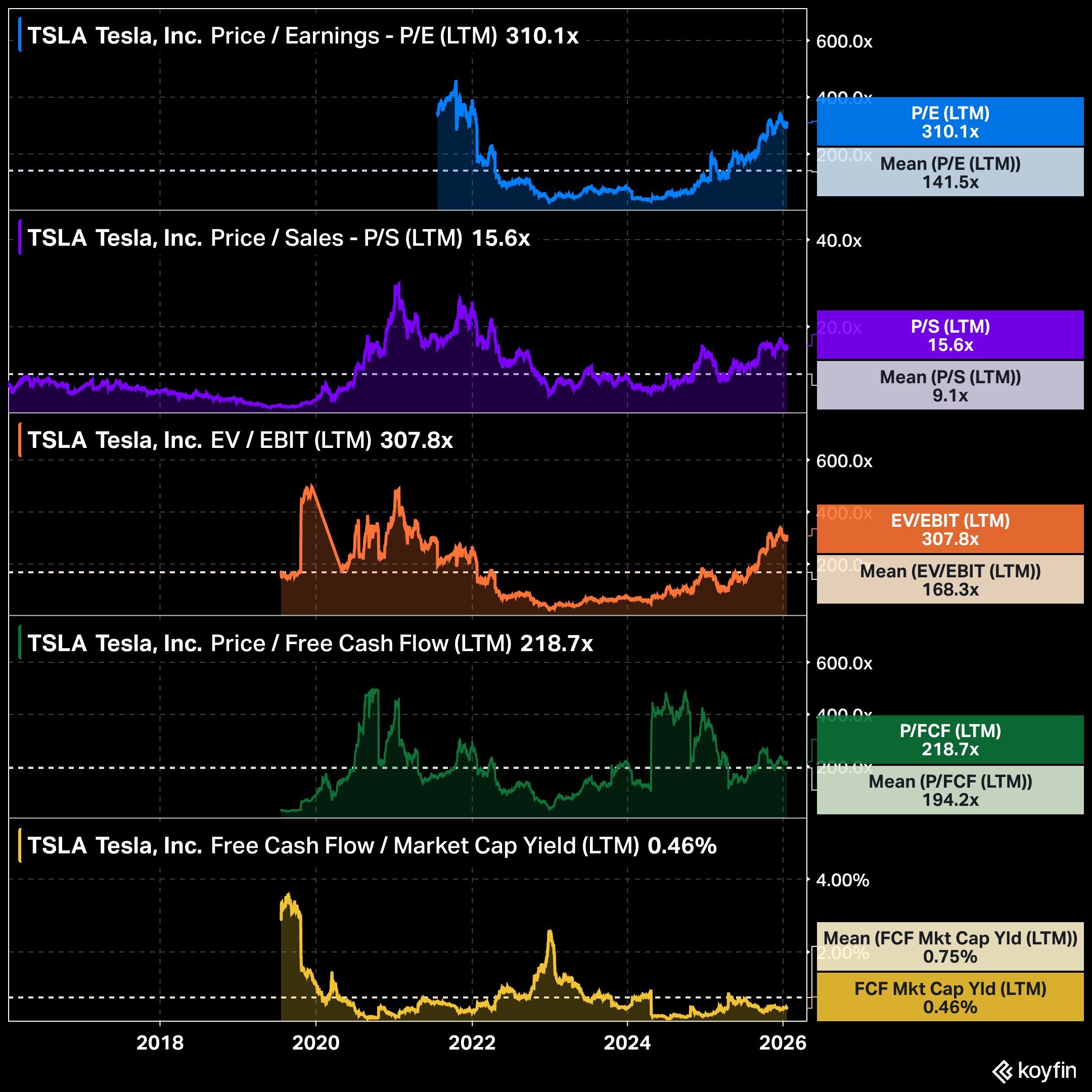 Tesla sticht mit 310x Forward KGV heraus, mehr als doppelt so hoch wie der historische Schnitt von 141x. Das KUV liegt bei 15,6x (Mittel: 9,1x), EV/EBIT bei 307,8x (Mittel: 168,3x), P/FCF bei 218,7x (Mittel: 194.2x). Die Free Cash Flow Rendite beträgt nur 0,46 % versus historisch 0,75 %. Tesla handelt über alle Metriken weit über Mittelwert. Netflix zeigt das Gegenteil: 33x KGV (Mittel: 117,6x), 8,4x KUV (Mittel: 8x), FCF Yield 2,48 % (Mittel: 1,47 %). Netflix ist günstiger geworden, während die Profitabilität gestiegen ist.