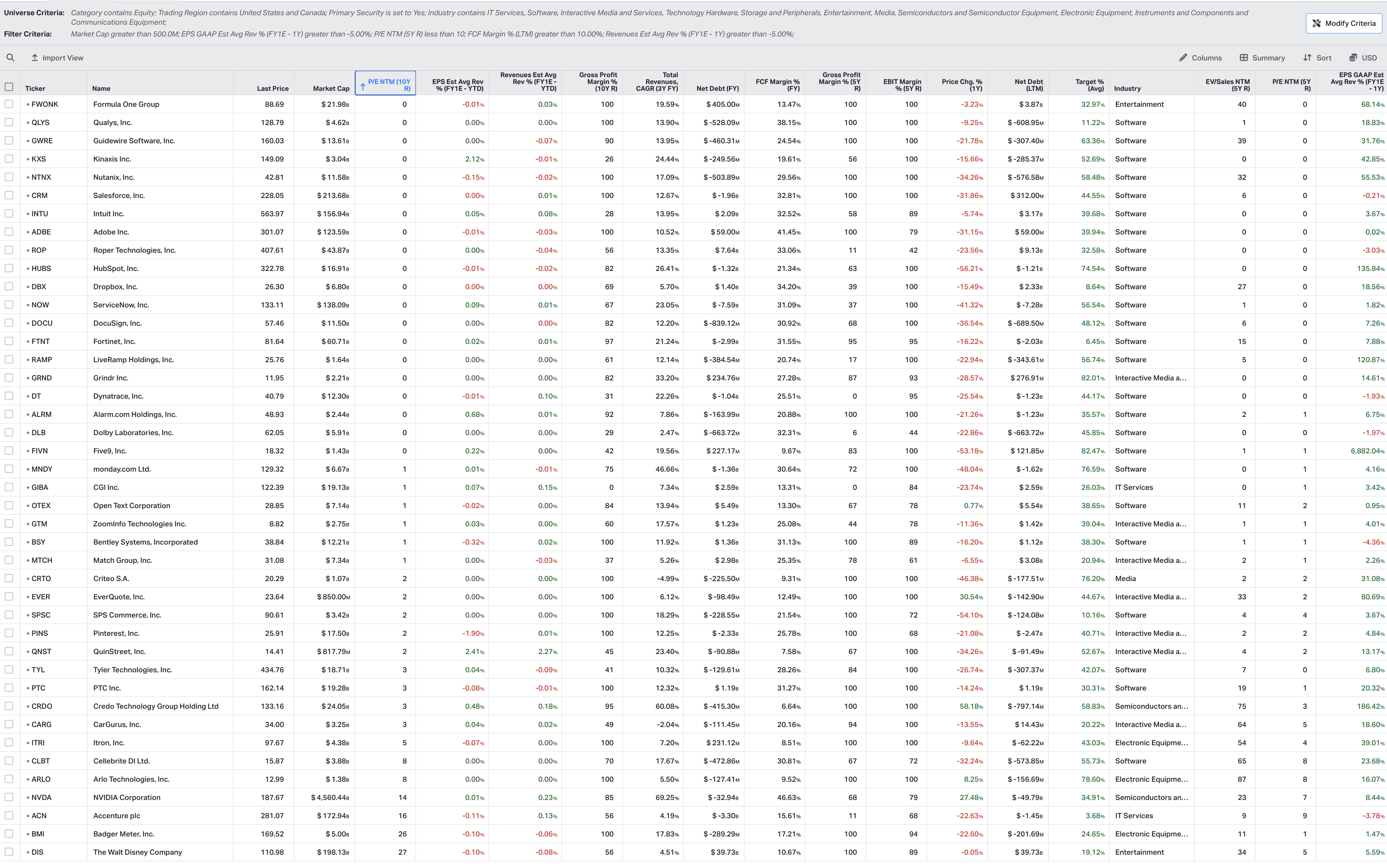 Das Screening filtert Firmen mit Marktkapitalisierung über 500 Millionen Dollar, die aktuell auf dem niedrigsten Bewertungsniveau seit 5 Jahren handeln. Gleichzeitig durften die Gewinnschätzungen für die nächsten 12 Monate im letzten Jahr maximal um 5 % sinken, Umsatzrevisionen ebenso. Free-Cashflow-Marge muss über 10 % liegen. Das Ergebnis: 42 Namen, dominiert von Software und IT-Services.