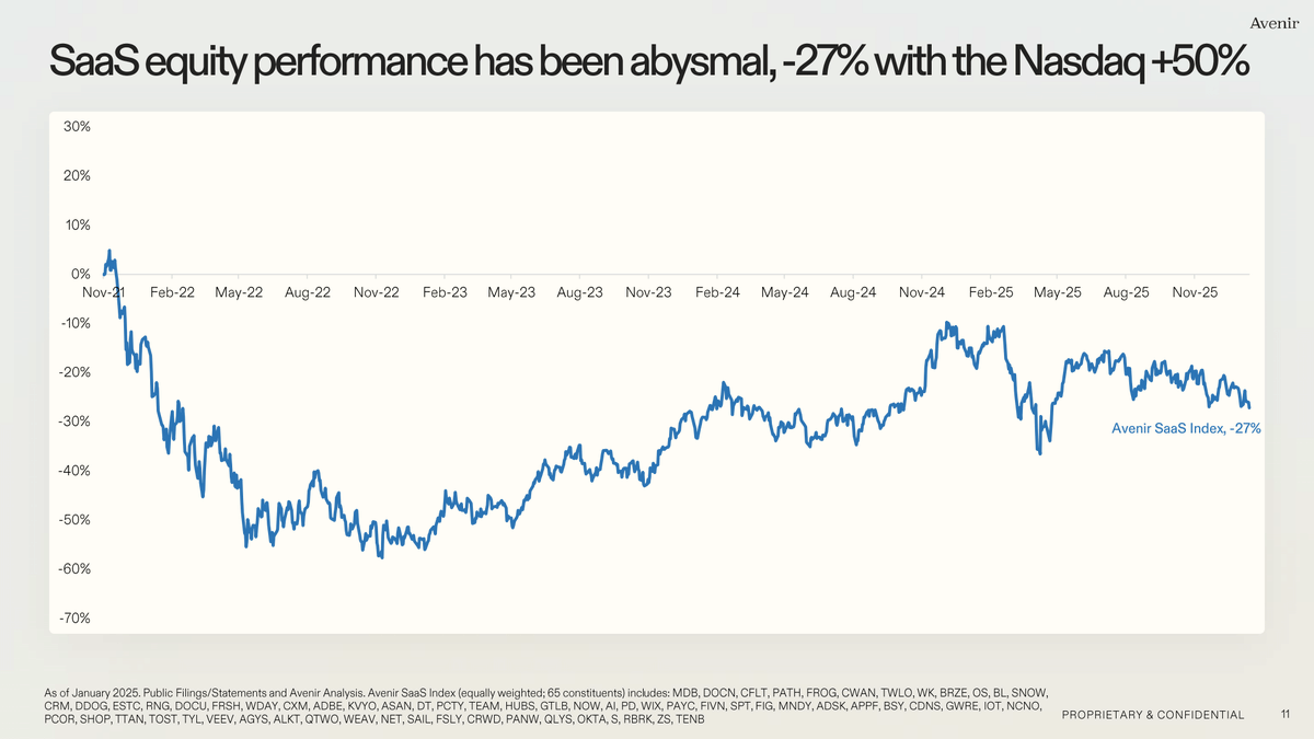 Seit November 2021 steht der SaaS-Index bei -27 %, während der Nasdaq +50 % zugelegt hat. Das ist eine Divergenz von 77 ppt. Aktuell liegt der Sektor wieder bei -27 %, weit unter dem Crash-Tief relativ zum Nasdaq.