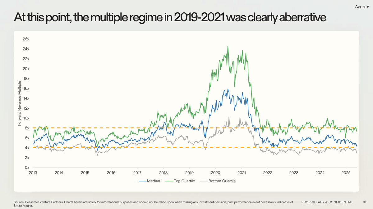 Der zweite Chart zeigt, warum. Die erwarteten Umsatz-Multiples im Top-Quartil erreichten 2021 ein Allzeithoch von 24, das Median-Multiple lag bei 16. Heute handelt das Top-Quartil bei 10, der Median bei unter 5. Das Bottom-Quartil dümpelt unter 4. Selbst die besten SaaS-Namen sind heute niedriger bewertet als durchschnittliche Namen 2019. Die Multiples sind auf Vorkrisenniveau zurückgefallen, obwohl viele Unternehmen profitabler gewachsen sind. Gewinnschätzungen halten sich für die besten SaaS-Firmen stabil.