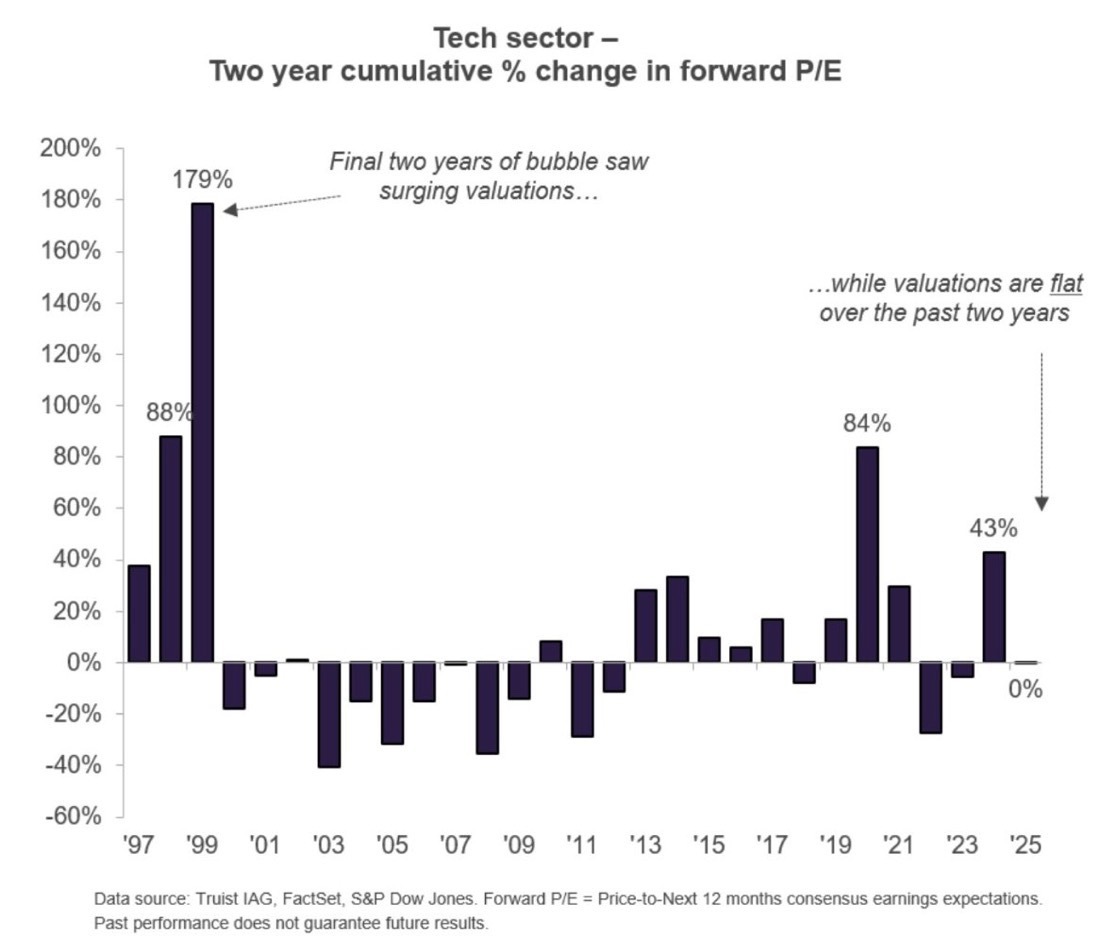 Das Forward-KGV des Technologiesektors liegt 2024/25 exakt bei 0 % Veränderung über zwei Jahre. Die Bewertungen haben sich nicht ausgeweitet. Das steht in radikalem Kontrast zur Dotcom-Phase. In den letzten zwei Jahren vor dem Crash 1999/00 stieg das Forward-KGV um 179 %. Bereits 1998 lag der Zweijahresanstieg bei 88 %, 1997 bei rund 38 %.