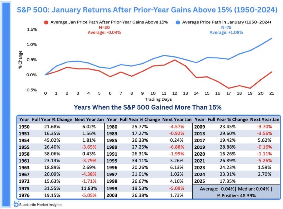 Nach Jahren mit mehr als 15 % Kursplus liegt die durchschnittliche Januar-Performance des S&P 500 bei -0,04 %. Das steht gegen den langfristigen Januar-Durchschnitt von +1,08 % über 75 Jahre. Von 30 Fällen seit 1950 endeten nur 48,39 % positiv, knapp unter Münzwurf.