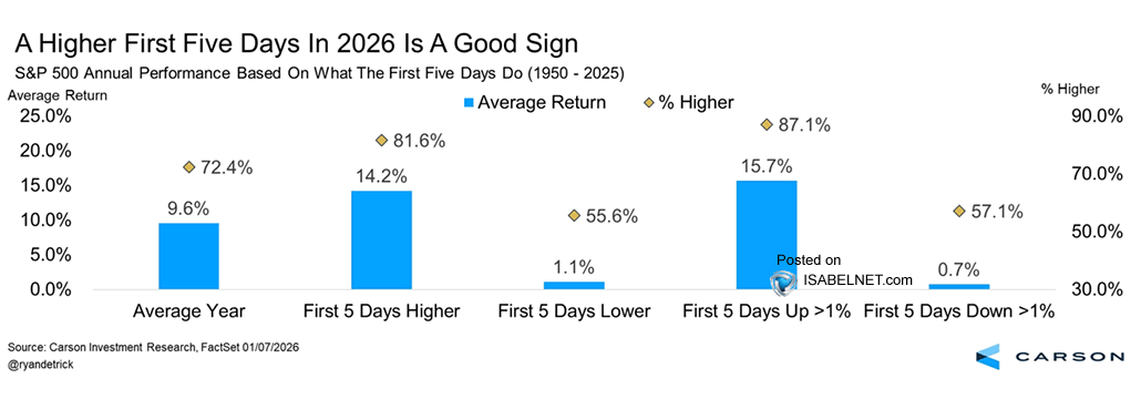 Die ersten fünf Tage spiegeln Positionierung, Sentiment und Liquidität zum Jahresstart. Starke Starts zeigen, dass Kapital fließt, nicht abwartet. Tax-Loss-Selling ist vorbei, neue Budgets sind aktiv, Fonds starten ihre Allokation. Ein positiver Start setzt Momentum, das sich oft durchs Jahr zieht. Umgekehrt signalisiert ein schwacher Start Vorsicht oder Verkaufsdruck, der Zeit braucht, um sich zu lösen.