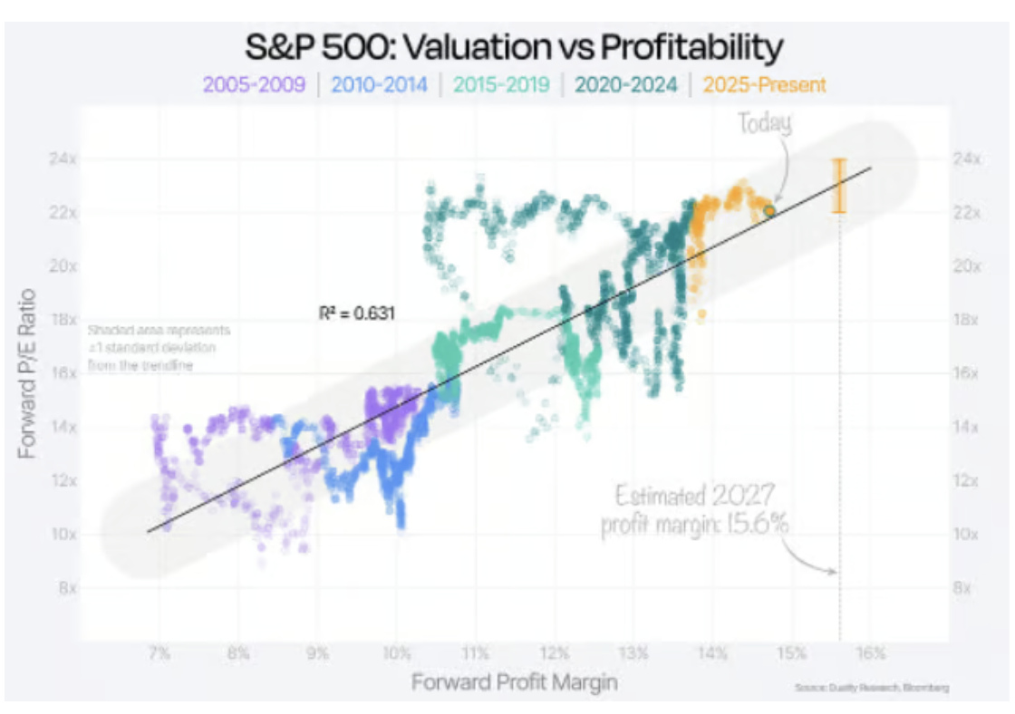 Das Forward-KGV des S&P 500 liegt aktuell bei rund 22/23, die erwartete Gewinnmarge bei etwa 15,6 %. Bewertung und Profitabilität korrelieren seit 2005 mit einem R² von 0,631. Das heißt, rund 63 % der Bewertungsschwankungen lassen sich durch Margenveränderungen erklären. Höhere Margen rechtfertigen höhere Multiples.