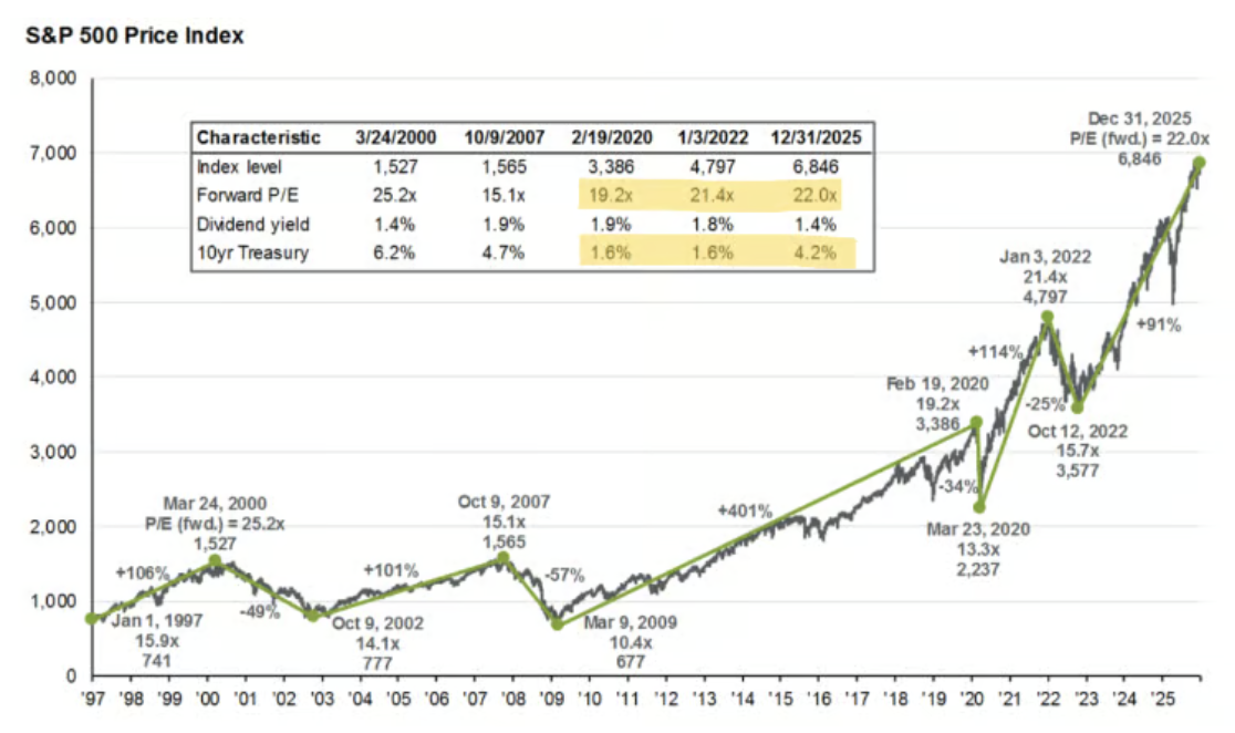 Der S&P 500 steht Ende 2025 bei einem Forward-KGV von 22 und einer Dividendenrendite von 1,4 %. Die 10-jährige Treasury liegt bei 4,2 %. Die Tabelle zeigt fünf Wendepunkte seit 2000.