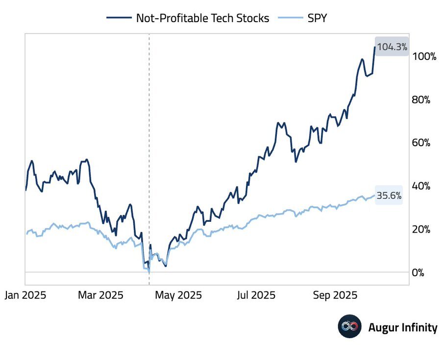 Seit dem Tief am 8. April 2025 haben nicht-profitable Tech-Aktien um über 104 % zugelegt, fast das Dreifache der Performance des breiten Marktes (S&P 500: +35,6 %).