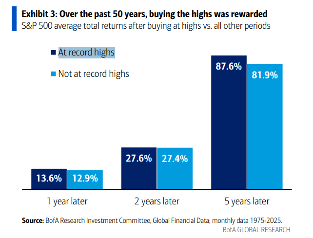 Die Grafik von BofA Global Research widerlegt einen der gängigsten Börsenmythen: Wer Aktien auf Rekordniveau kauft, erleidet langfristig keinen Renditenachteil, im Gegenteil.