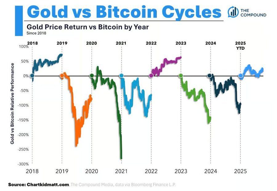 📌 Gold schlägt Bitcoin im Jahr 2025 (relativer Performancezyklus zwischen Gold und Bitcoin seit 2018)