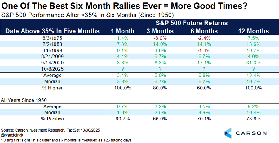 Der S&P 500 hat in den vergangenen sechs Monaten mehr als 35 % zugelegt, eine der stärksten Halbjahresrallys seit 1950. Ein derartiger Anstieg trat bisher nur fünfmal auf, zuletzt 2020, 2009 und 1983. In allen fünf Fällen lagen die Kurse ein Jahr später erneut höher, im Schnitt um 13,4 %. Kurzfristig war die Volatilität teils hoch, doch mittel- bis langfristig folgten meist weitere Gewinne.