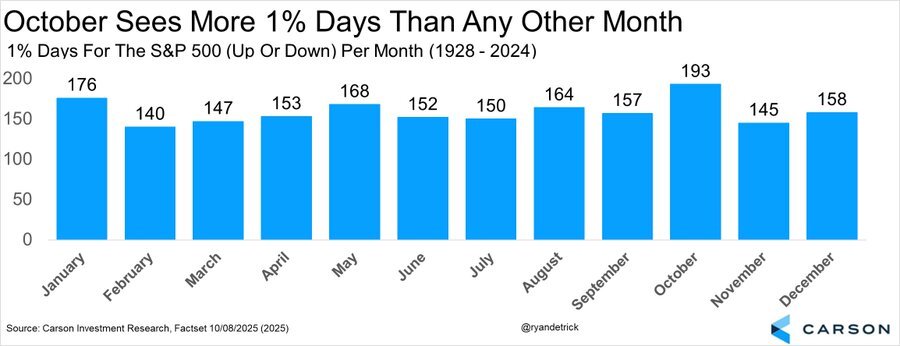 Kein Monat bringt dem S&P 500 so viele 1%-Bewegungen (aufwärts oder abwärts) wie der Oktober. Seit 1928 verzeichnete der Index in diesem Monat 193 Handelstage mit Schwankungen von mindestens 1 %. Der Durchschnitt liegt bei rund 155 solchen Tagen in anderen Monaten. Der Oktober gilt damit nicht zufällig als "Volatility Month" der Wall Street. Historische Krisen wie 1987, 2008 oder 2022 fielen ebenfalls in diese Phase.