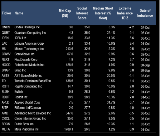 Diese Tabelle zeigt, welche Aktien aktuell die höchste Kombination aus Social Interest (Diskussionen, Erwähnungen, Sentiment) und Short Interest (leerverkaufte Anteile) aufweisen. Ein klassisches Rezept für kurzfristige Volatilität oder Short Squeezes.