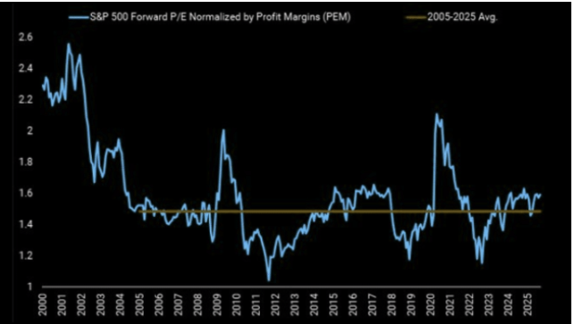 Die Grafik von Morgan Stanley zeigt das S&P 500 Forward KGV, bereinigt um Gewinnmargen, und setzt es in Relation zum Durchschnitt seit 2005. Während klassische Bewertungskennzahlen oft überdurchschnittlich hoch erscheinen, relativiert sich das Bild deutlich, wenn man die außergewöhnlich hohen Margen der vergangenen Jahre berücksichtigt.Auf Basis der Margenentwicklung ist der US-Aktienmarkt keineswegs in einer Bewertungsblase, sondern bewegt sich, trotz Rekordkursen, in einer historisch vertretbaren Spanne.