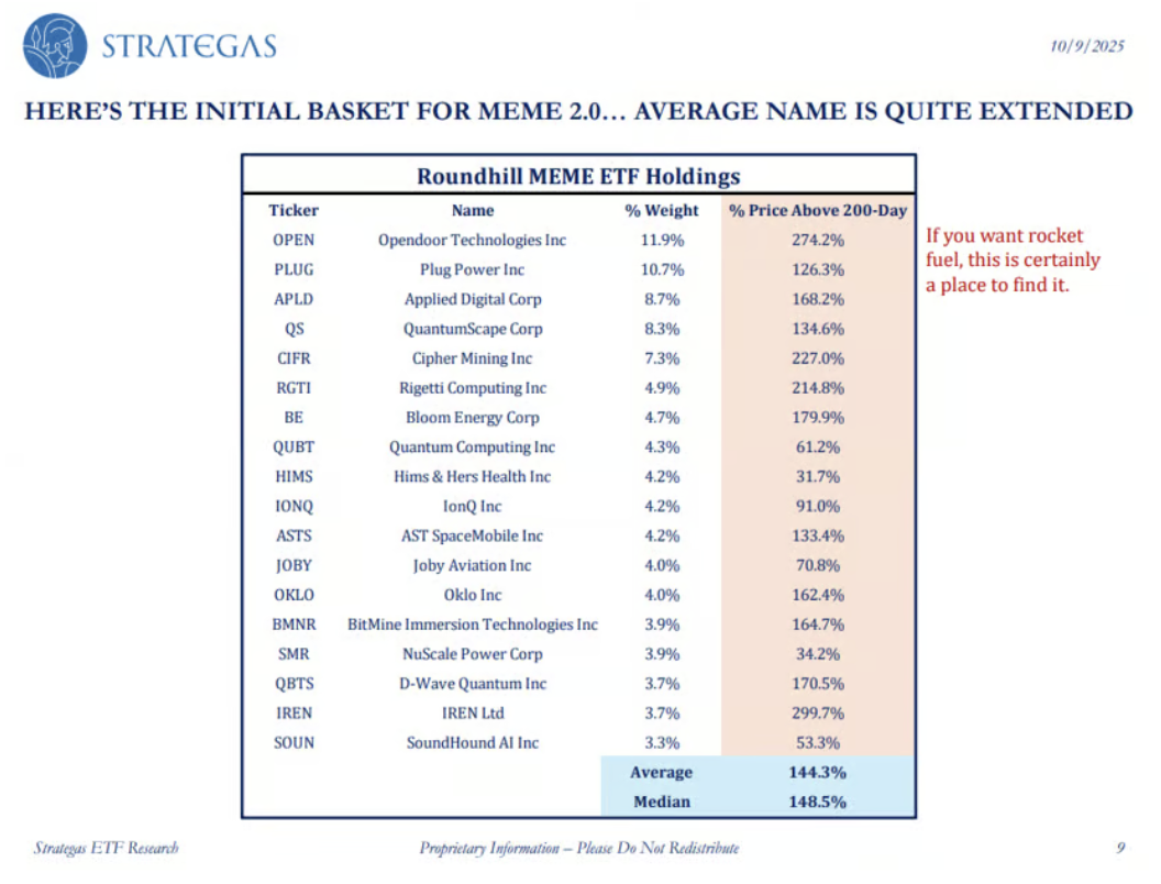 Nach einer zweijährigen Pause ist der Roundhill MEME ETF wieder auf die Bühne zurückkehrt, pünktlich zum erneuten Aufschwung spekulativer Wachstumswerte. Während die erste Notierung Ende 2021 mitten im Hype um Innovation und ARK Invest erfolgte, kam das De-Listing Ende 2023 in einer Phase der Ernüchterung. Nun, im Oktober 2025, markiert die Re-Listung den Beginn einer neuen Risikophase: Die enthaltenen Aktien notieren im Schnitt rund 145 % über ihrem 200-Tage-Durchschnitt. Wer nach "rocket fuel" sucht, findet es hier. Doch solche Rallys leben vom Momentum, nicht von Fundamentaldaten.
