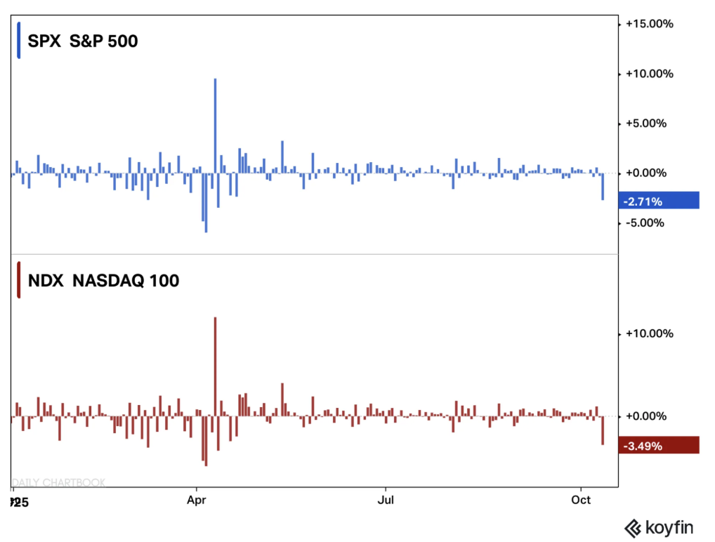 Die Ruhe war trügerisch. Nach fast vier Monaten nahezu ununterbrochenen Anstiegs kam der amerikanische Aktienmarkt nun wieder abrupt ins Wanken. Der S&P 500 verlor 2,7 %, der Nasdaq 100 sogar 3,5 %: der stärkste Tagesverlust seit den turbulenten April-Tagen.