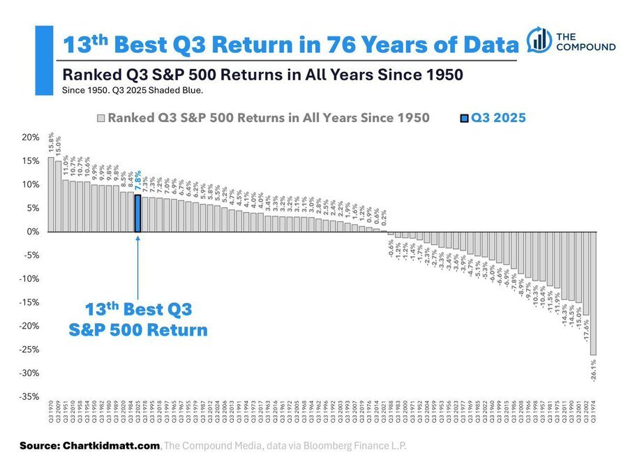 Mit einem Plus von 7,8 % markiert das dritte Quartal 2025 den 13. besten Q3 Gewinn des S&P 500 seit Beginn der Aufzeichnungen im Jahr 1950.