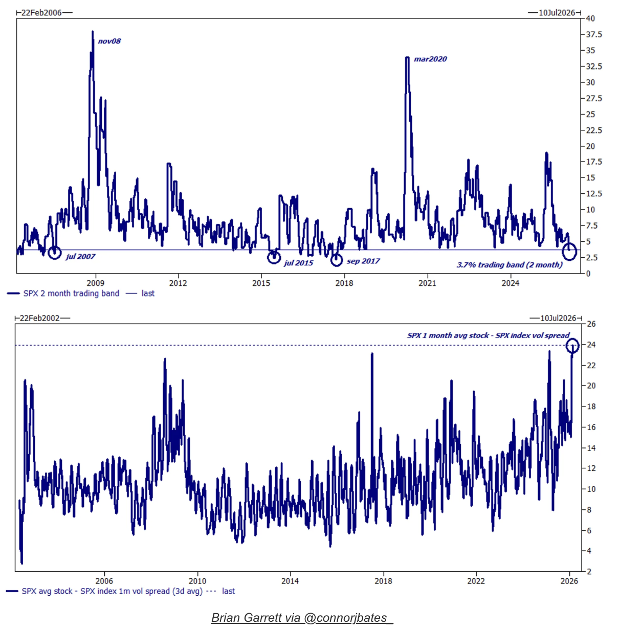 Parallel dazu erreicht die Differenz zwischen der durchschnittlichen Ein-Monats-Volatilität einer Aktie und der Indexvolatilität rund 25 Punkte. Dieser Spread ist der höchste Wert im gesamten Beobachtungszeitraum seit 2002. Frühere Spitzen lagen deutlich darunter, selbst während 2008 oder 2020.