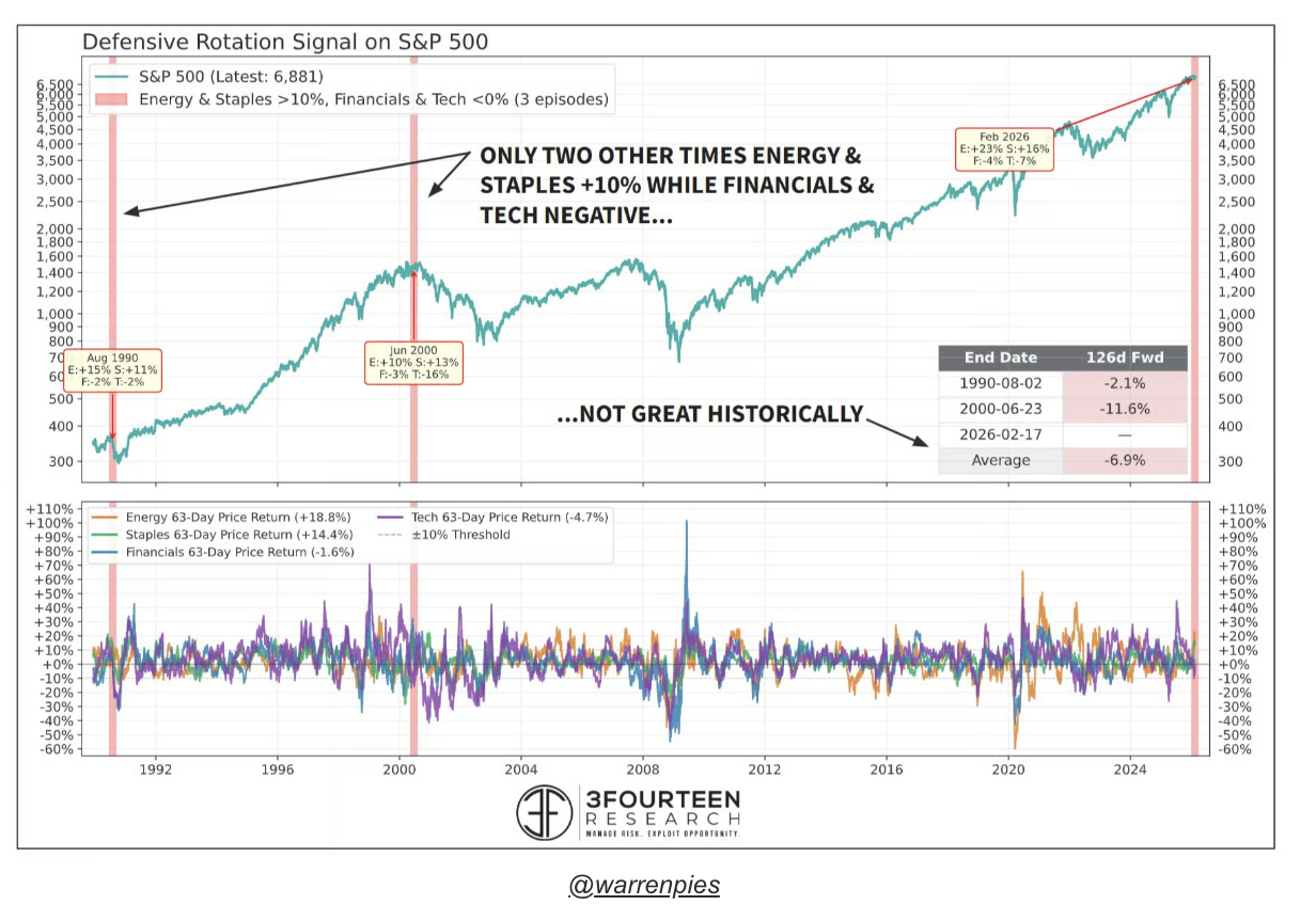 Über die vergangenen 63 Handelstage steigen Energie um 18,8 % und Basiskonsum um 14,4 %, während Finanzwerte minus 1,6 % und Tech minus 4,7 % verzeichnen. Diese Konstellation trat seit 1990 lediglich zweimal zuvor auf, im August 1990 und im Juni 2000.