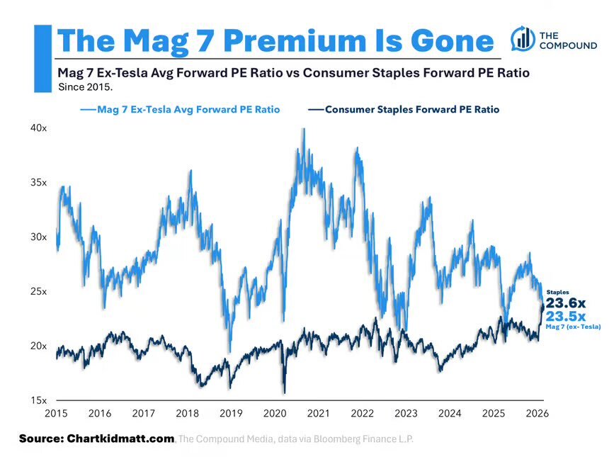 Basiskonsumgüter stehen bei 23,6 Forward-KGV, die Mag 7 ohne Tesla bei 23,5. Damit liegt die Tech-Elite heute auf dem Niveau, teils sogar minimal unter dem defensivsten Bereich des Markts. Viele reden immer noch, als wären die Mag 7 "teuer wie 2021". Der Chart sagt das Gegenteil. Defensive Qualität wurde gekauft, fast wie eine Anleihe mit Markenlogo. Das Risiko sitzt eher in den Erwartungen an Stabilität bei Staples als in einem Tech-Premium, das aktuell kaum existiert.