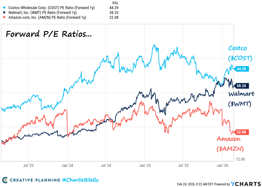 Costco liegt bei 44,3, Walmart bei 38,3. Amazon steht bei 22. Der Markt bezahlt bei Costco und Walmart nicht Wachstum, sondern Verlässlichkeit. Planbare Umsätze, defensive Nachfrage, starke Preissetzung und das Narrativ, dass sie in jeder Konjunktur Kunden anziehen. Das drückt das Risiko im Bewertungsmodell und zieht das Multiple hoch. Amazon bekommt den Abschlag, weil Gewinne stark von Investitionen abhängen. Nichtsdestotrotz ist der Spread so groß wie selten zuvor.