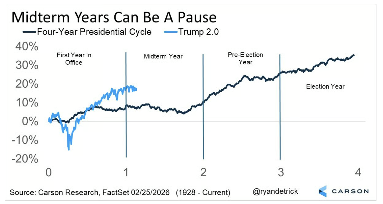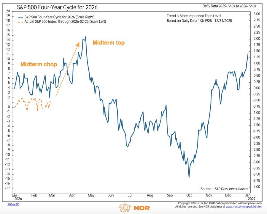 Historisch steigt der Index im Zwischenwahljahr häufig ab März an und erreicht im Zeitraum März bis April ein Zwischenhoch. Von Mai bis Oktober fällt der historische Durchschnitt in negatives Terrain und markiert im Herbst ein zyklisches Tief. Erst gegen Jahresende dreht der Index wieder nach oben.