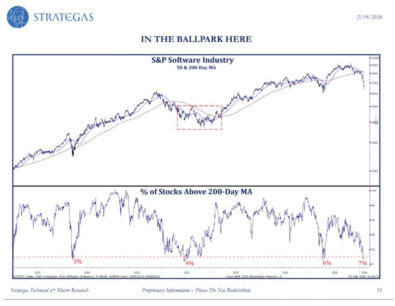 Im Software Sektor fällt der Anteil der Aktien über ihrer 200-Tage-Linie zuletzt auf rund 7 %. Historisch lagen vergleichbare Extremwerte nur bei etwa 5 % im Jahr 2020, 4 % im Bärenmarkt 2022 und rund 6 % während der Korrektur 2025.