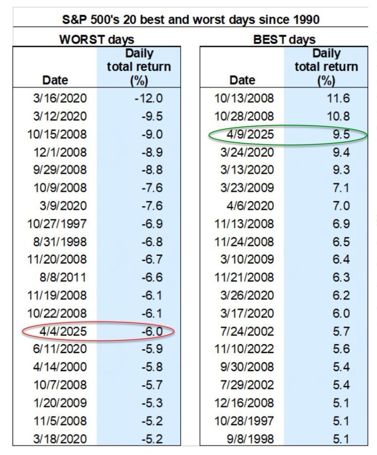 Die Tabelle zeigt die 20 besten und schlechtesten Tage des S&P 500 seit 1990. Der April 2025 umfasst sowohl den drittbesten Tag der Geschichte (9. April 2025 mit einem täglichen Gesamt-Return von 9,5 %) als auch den vierzehntschlechtesten Tag (4. April 2025 mit einem Rückgang von -6,0 %).