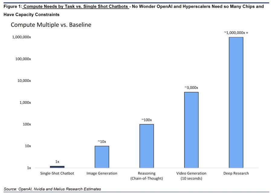 Während einfache Chatbot-Anfragen als Basis (1x) dienen, benötigt Bildgenerierung bereits das Zehnfache an Rechenleistung, logisches "Chain-of-Thought"-Denken etwa das Hundertfache. Bei Videogenerierung steigt der Faktor auf rund 3.000, und für komplexe Forschungsaufgaben ("Deep Research") sind sogar über eine Millionfache Compute-Kapazitäten nötig.