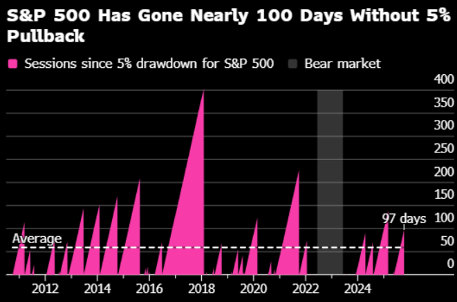 Die Bloomberg-Grafik zeigt, dass der S&P 500 inzwischen fast 100 Handelstage ohne einen Rückgang von 5 % überstanden hat. Solche Phasen relativer Ruhe endeten in der Vergangenheit meist mit gesunden Korrekturen. Das gehört dazu, vergesst das nicht!
