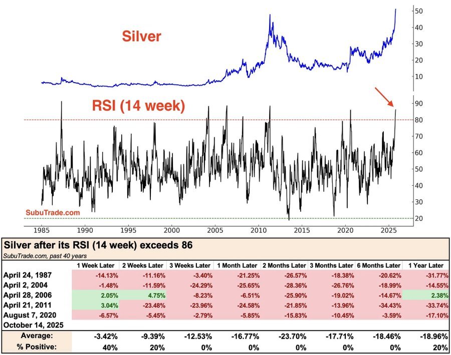Der Wochen-RSI (14 Wochen) von Silber liegt aktuell bei 86. Das ist der höchste Werte der vergangenen 40 Jahre. Historisch markierten solche Extremstände oft lokale Tops. In den fünf vergleichbaren Fällen seit 1987 folgten im Schnitt Kursverluste von rund 17 bis 19 % über die nächsten Monate.
