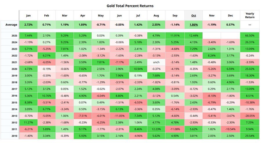 Mit einem Plus von rund 65 % seit Jahresbeginn steuert Gold 2025 auf das beste Jahr seit über vier Jahrzehnten zu. Die saisonale Heatmap zeigt, dass Gold vor allem im Frühjahr und Herbst zu kräftigen Zugewinnen neigt, 2025 allerdings über alle Phasen hinweg außergewöhnlich stark war.