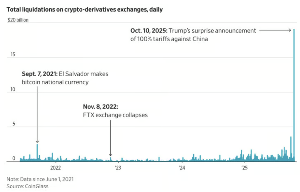 Die Grafik von CoinGlass zeigt den größten Liquidationstag in der Geschichte der Krypto-Derivatemärkte: Am 10. Oktober 2025, unmittelbar nach der überraschenden Ankündigung von 100 % US-Zöllen auf chinesische Importe, wurden über 20 Milliarden USD an Positionen aufgelöst. Damit übertrifft das Ereignis selbst frühere Extremphasen wie den FTX-Kollaps im November 2022 deutlich.
