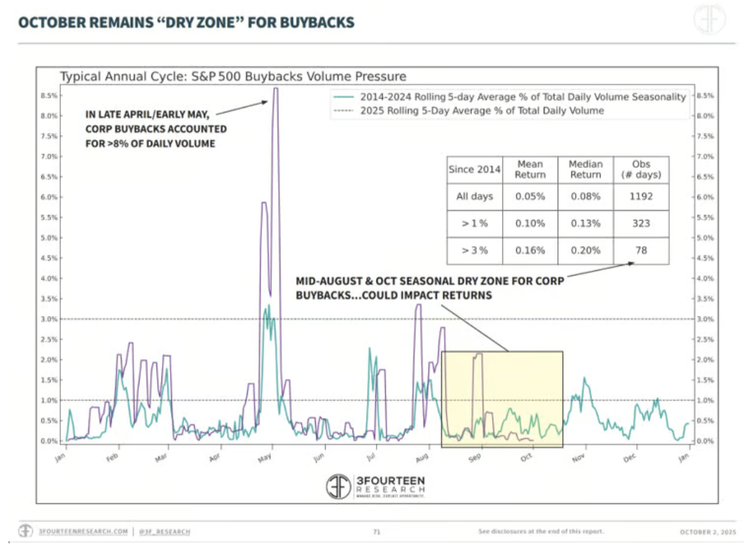 Laut 3Fourteen Research befindet sich der Markt derzeit in einer saisonalen Flautephase für Aktienrückkäufe. Historisch sinkt der Anteil von Buybacks an den täglichen Handelsvolumina im Oktober und in der zweiten Augusthälfte deutlich - oft auf unter 1 %. Im Gegensatz dazu machen Rückkäufe im Frühjahr regelmäßig über 8 % des Handelsvolumens aus und stützen so die Kurse.