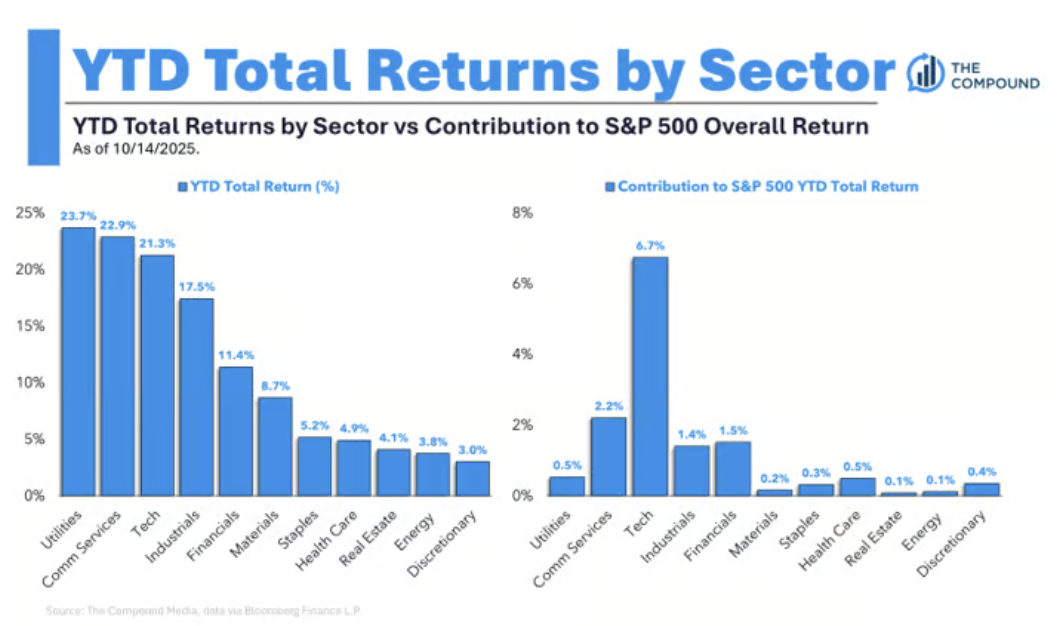 Mit einem durchschnittlichen Plus von gut 21 % stellt der Technologie-Sektor nicht nur eine der stärksten Performancegruppen, sondern mit 6,7 Prozentpunkten auch den größten Beitrag zur Gesamtrendite des Index. Überraschend vor allem, Utilities (Rally in allen Versorgern, wegen KI) und Communication Services (Meta+Alphabet als Treiber), die mit Renditen von über 22 % sogar leicht vor Tech liegen. Dennoch bleibt ihr Einfluss auf den Gesamtmarkt begrenzt, da ihre Indexgewichte deutlich kleiner sind.
