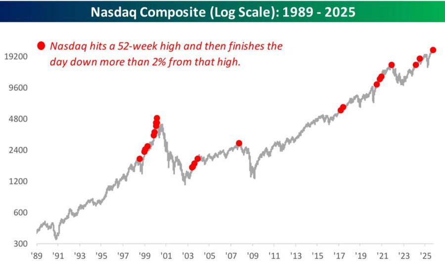Die Grafik zeigt alle Tage, an denen der Nasdaq ein neues 52-Wochen-Hoch markierte, nur um anschließend mehr als 2 % unter diesem Hoch zu schließen. Solche Ereignisse traten historisch nur in Phasen überhitzter Marktstimmung auf, etwa kurz vor den Einbrüchen 2000, 2007 oder 2021. Erst vor wenigen Tagen hatten wir erneut diesen Case, aber diesmal alles andere als Euphorie. Siehe extreme Fear oder spikenden VIX.