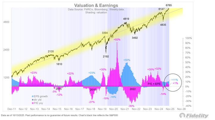 Nach zwei Jahren starker Bewertungszugewinne stammen die Kurszuwächse 2025 fast ausschließlich aus dem Gewinnwachstum der Unternehmen: Die Gewinne (blau) legten im Jahresvergleich um 11 % zu, während das KGV (lila) nur um 1 % anstieg.