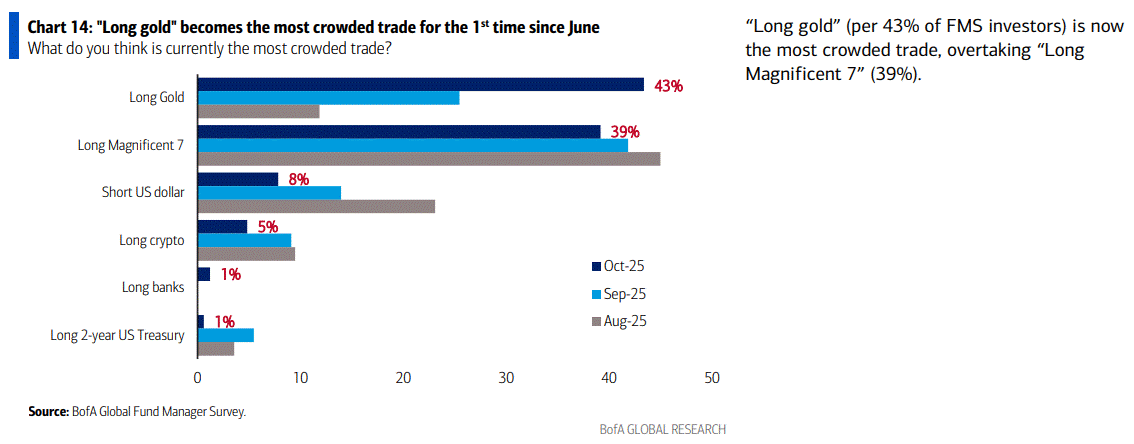 Erstmals seit Juni gilt "Long Gold" wieder als der meist überlaufener Trade. 43 % der befragten Fondsmanager sehen derzeit Engagements in Gold als überlaufen.