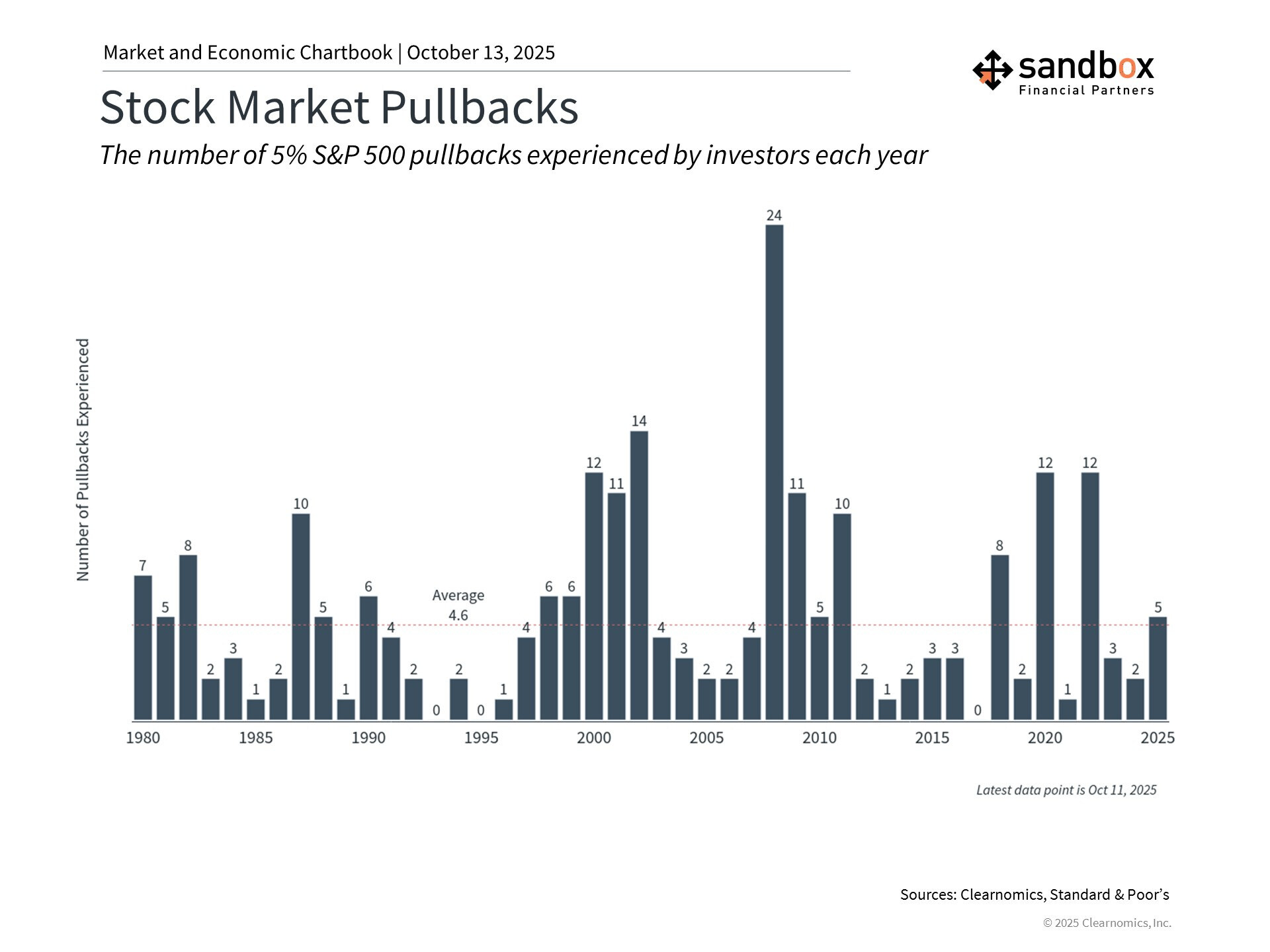 Der S&P 500 hat seit 1980 im Durchschnitt etwa 4,6 pro Jahr einen Rücksetzer von mindestens 5 % erlebt. 2025 liegt mit bislang fünf Pullbacks exakt im historischen Mittel.