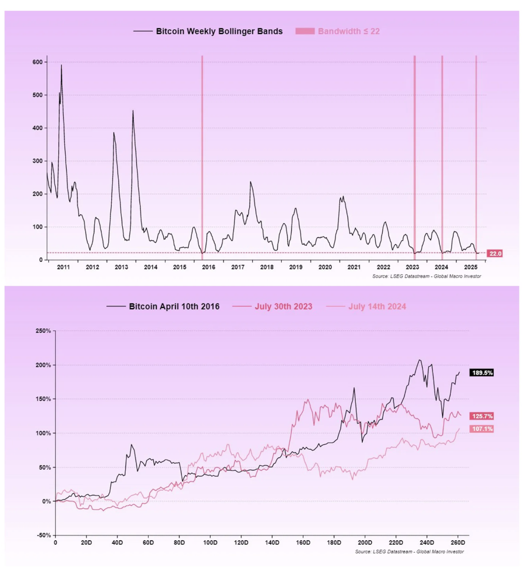 Die Bollinger-Bänder von Bitcoin verlaufen aktuell so eng wie nur drei Mal zuvor in der gesamten Historie. Solch geringe Volatilität trat zuletzt 2016, 2020 und 2023 auf und ging jeweils deutlichen Kursanstiegen voraus. Die untere Grafik verdeutlicht diesen Effekt: Nach Phasen geringer Vola folgten in den darauffolgenden Monaten Anstiege von über 100 % bis fast 190 %. Je länger der Druck, desto stärker der folgende Auftrieb.