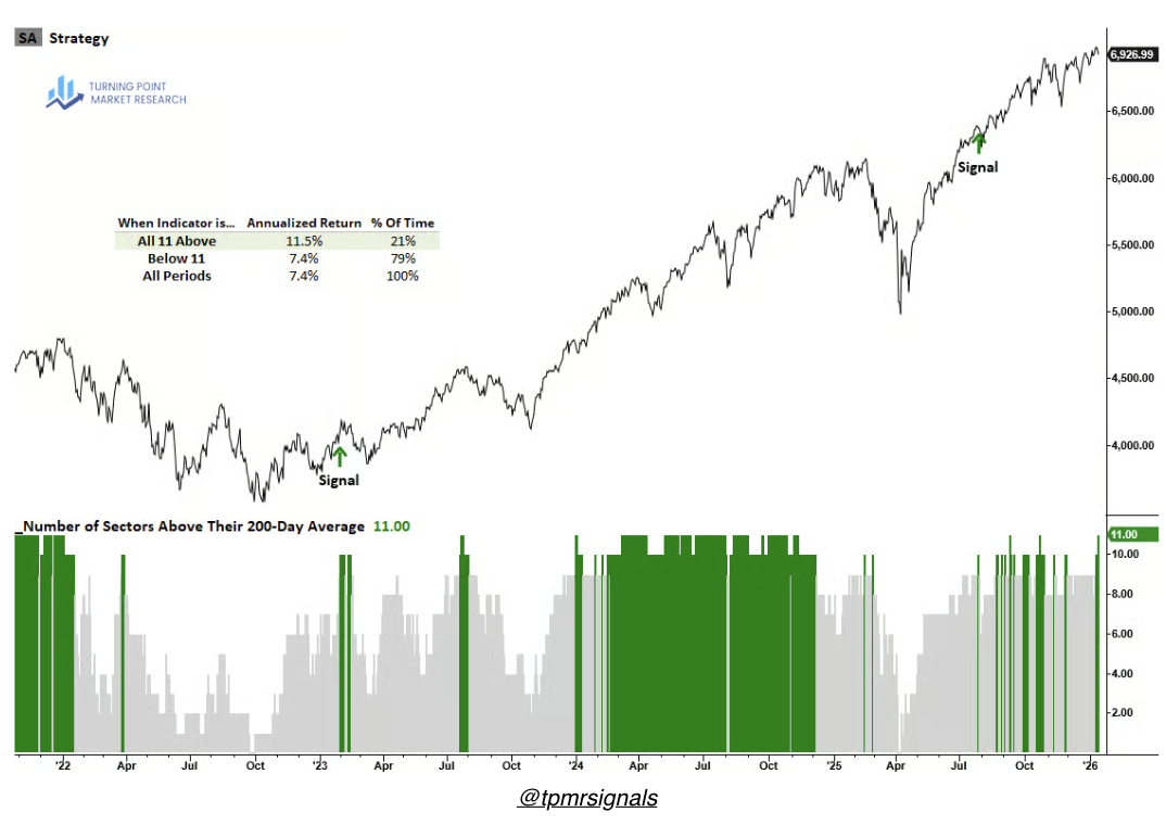 Wenn alle elf S&P- 500-Sektoren über ihrer 200-Tage-Linie notieren, liegt die annualisierte Rendite im S&P 500 bei 11,5 %. Dieses Setup trat nur in 21 % der Zeit auf. Wenn weniger als elf Sektoren über ihrer 200-Tage-Linie liegen, fällt die annualisierte Rendite auf 7,4 %.