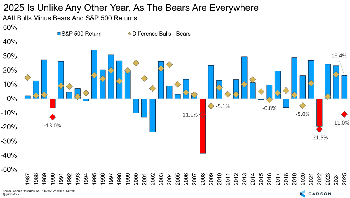 Mit rund 11 Prozentpunkten mehr Bären als Bullen ordnet sich 2025 in eine Reihe mit 1990, 2008 und 2022 ein. Alles Jahre, in denen die Märkte deutlich unter Druck standen. Statt Euphorie dominiert Skepsis, obwohl die Marktperformance das Gegenteil vermuten lässt.