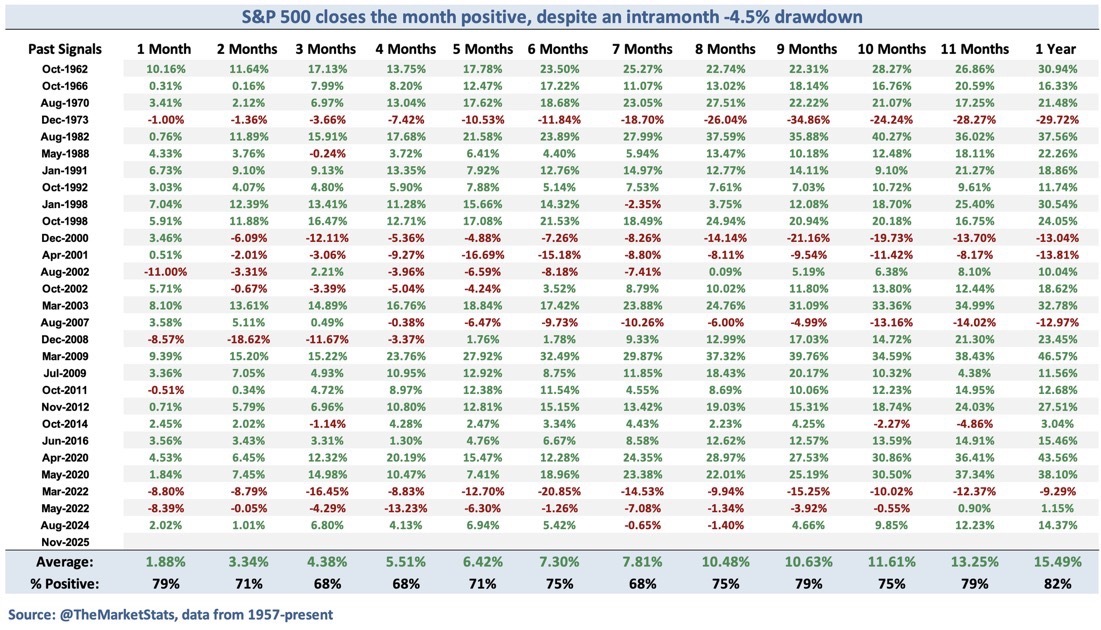 Die Tabelle zeigt, wie seltene, aber statistisch aussagekräftige Muster am Markt wirken: Wenn der S&P 500 einen Monat im Plus beendet, obwohl er zwischenzeitlich um mehr als 4,5 % gefallen ist, folgte historisch in knapp 80 % der Fälle ein weiterer Anstieg im Folgemonat. Wer also wegen irgendwelcher Chartmuster verkauft: autsch!