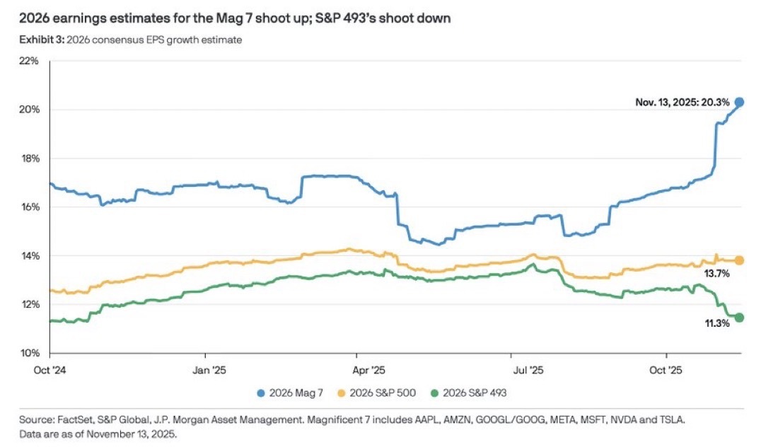 Während die Gewinnschätzungen für die "Magnificent 7" seit Herbst 2024 deutlich nach oben gezogen wurden und zuletzt über 20 % lagen, bleiben die Erwartungen für den restlichen S&P 493 weit zurück und sind zuletzt sogar gefallen.