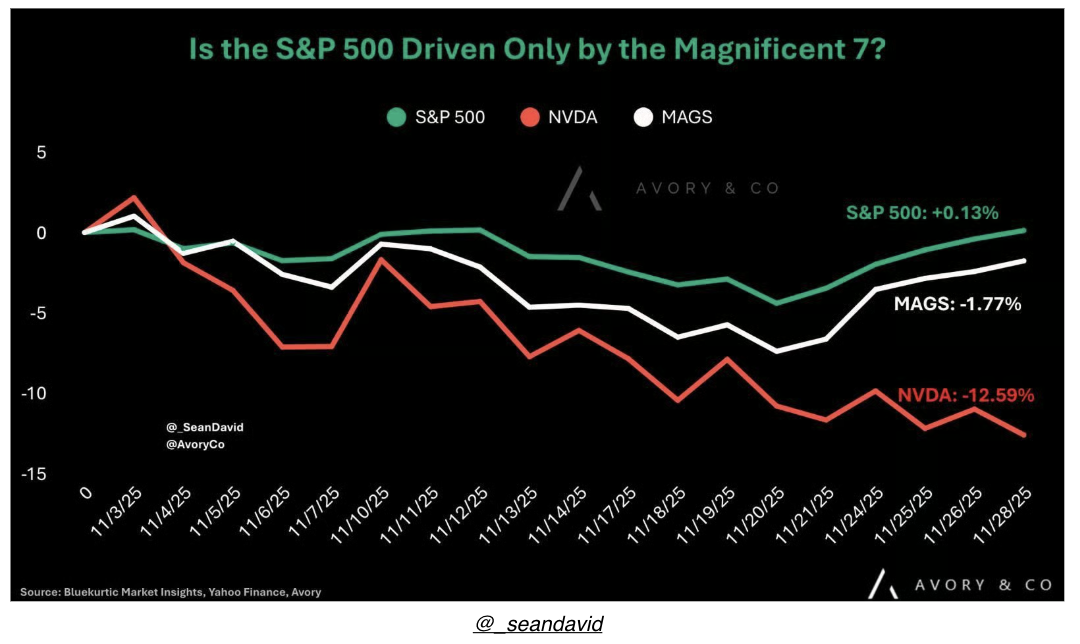Die Grafik zeigt, dass sich der S&P 500 im November leicht im Plus halten konnte, obwohl NVIDIA zweistellig verlor und auch die übrigen Mag 7 insgesamt im Minus lagen. Die Marktmechanik funktioniert also auch dann, wenn der übliche Wachstumsmotor nicht zieht.