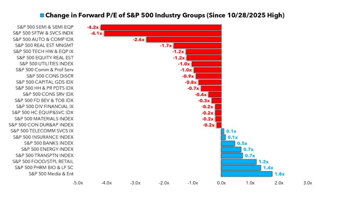 Der Markt wirkt heute deutlich "gesünder" bewertet als Ende Oktober. Seit dem Hoch am 28.10. haben 17 von 25 S&P-500-Industrien ihre Forward-KGVs zurückgebildet.