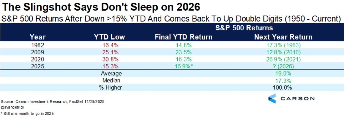 In den Jahren, in denen der S&P 500 zur Jahresmitte mehr als 15 % im Minus lag und das Jahr dennoch mit einem zweistelligen Plus beendete, folgte historisch stets ein weiteres starkes Jahr.