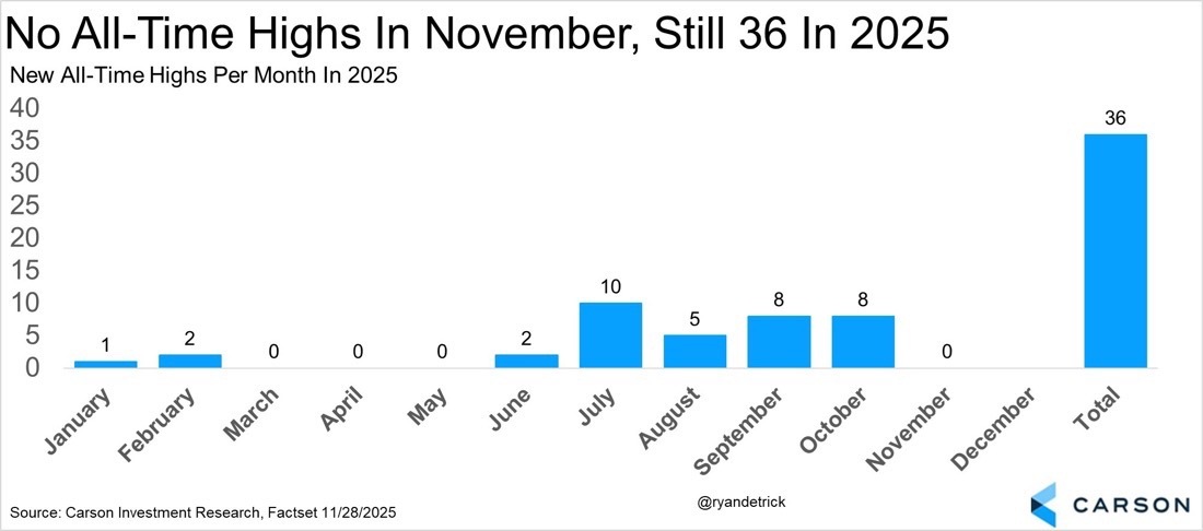 Während März, April, Mai und nun auch der November ohne neue Rekorde blieben, summieren sich über das Jahr hinweg dennoch 36 frische Höchststände, vor allem getragen von starken Sommer- und Herbstmonaten. Das Ausbleiben neuer Highs in einzelnen Monaten sagt aber wenig über die Marktstärke des Gesamtjahres aus.