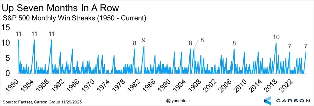 Die Grafik wiederum ordnet die aktuelle Gewinnserie des S&P 500 ein: sieben positive Monate am Stück sind bemerkenswert, kommen aber in der langen Markthistorie immer wieder vor. Extremphasen wie elfmonatige Serien in den 1950ern oder zehn Monate 2018 zeigen, dass starke Trends durchaus länger tragen können.