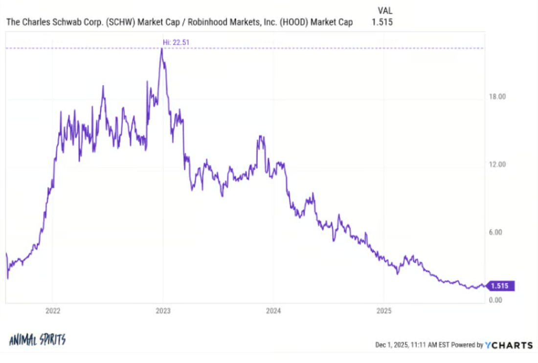 Der Chart zeigt das Verhältnis der Marktkapitalisierung von Charles Schwab zu Robinhood über den Zeitraum seit 2021. Vom Hoch bei über 22 ist das Verhältnis bis Ende 2025 auf rund 1,5 gefallen.
