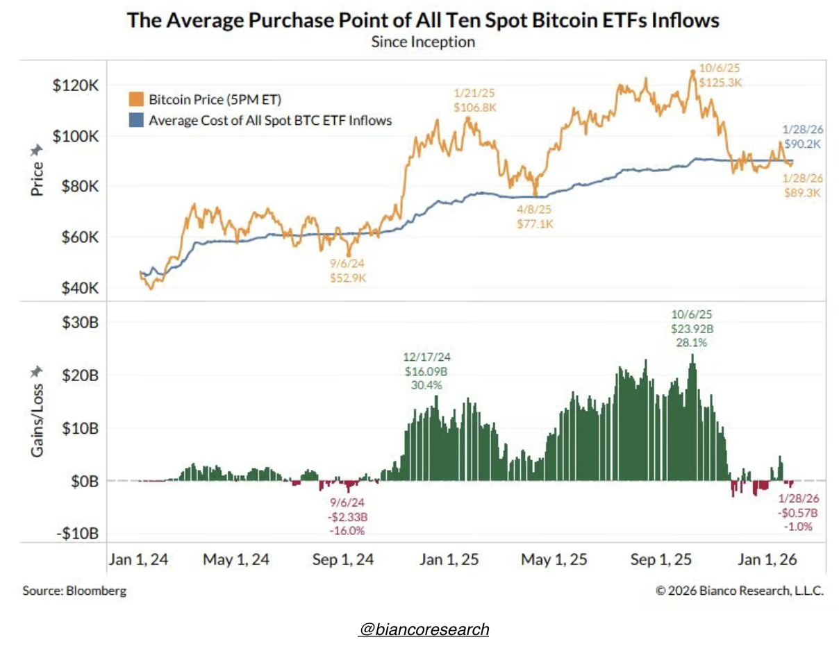 Der obere Chart zeigt in Orange den Bitcoin-Preis und in Blau die durchschnittlichen Kosten aller Spot-BTC-ETF-Zuflüsse. Bitcoin stieg bis Oktober 2025 auf 125.300 USD, die blaue Linie folgte auf 90.200 USD. Dann der Crash. Am 28. Januar lag Bitcoin bei 89.300 USD, unter der blauen Linie. Das ist das erste Mal, dass der Durchschnittskäufer im Minus ist.